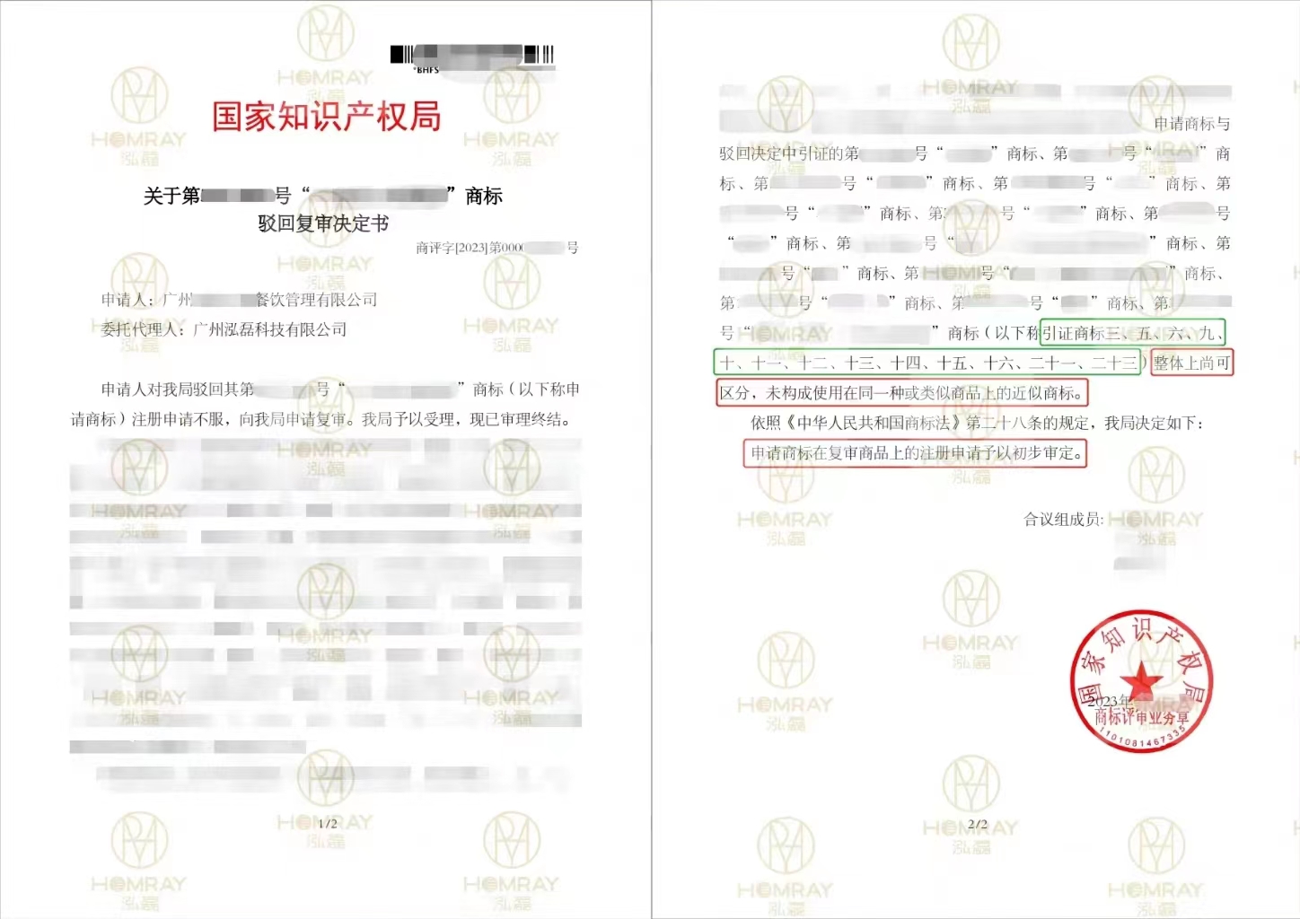 我司通过对核心阻碍的在先引证商标启动复合型非诉案件及对客户新LOGO商标启动驳回复审的手段,成功说服商标评审合议组客户商标能与23个在先引证商标区分开,不容易造成消费者混淆,故客户商标成功进入初审公告。