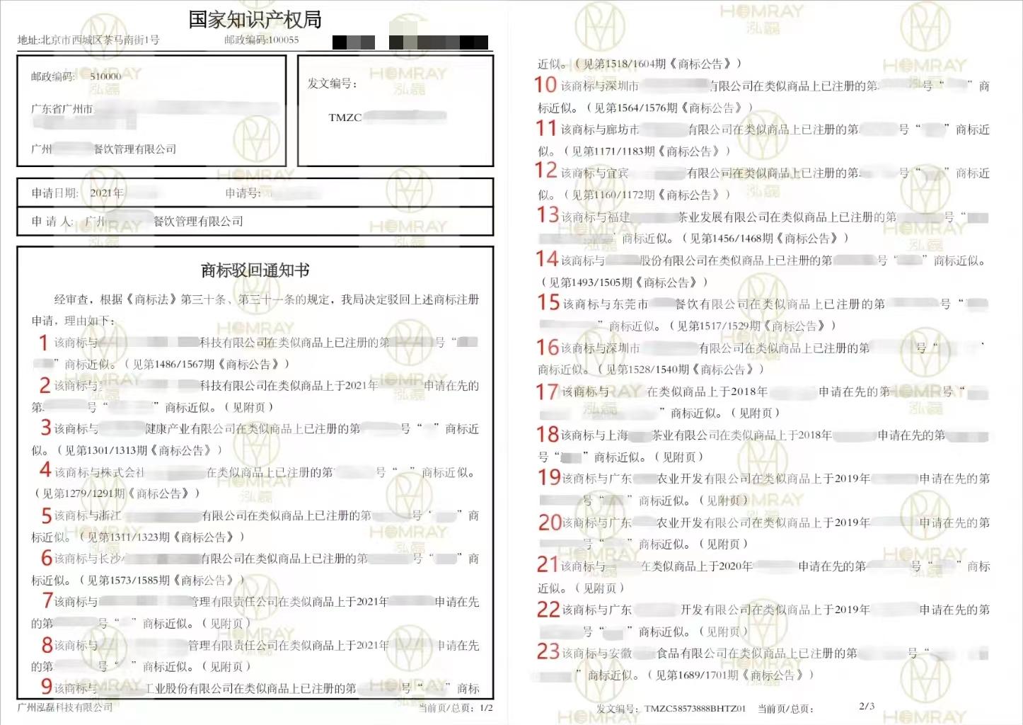 客户的旧LOGO商标(中文商标)最早于2017年6月已在第30类上成功注册,但经过2次品牌VI升级后,新LOGO商标(图形+中文商标)之前多次申请均被驳回且启动驳回复审,但国家知识产权局的商标审查员在过往驳回复审决定书中均认为客户新LOGO商标未能跟引证的在先近似商标区别开。本次新LOGO商标在第30类上的申请再次被驳回,且审查员引证了23个在先近似商标,此为客户商标被驳回历史上被引用个数最多的一次。